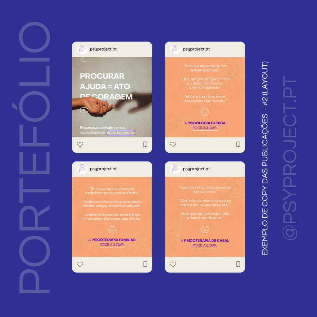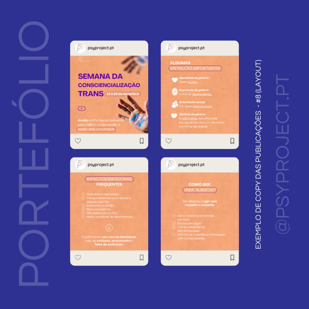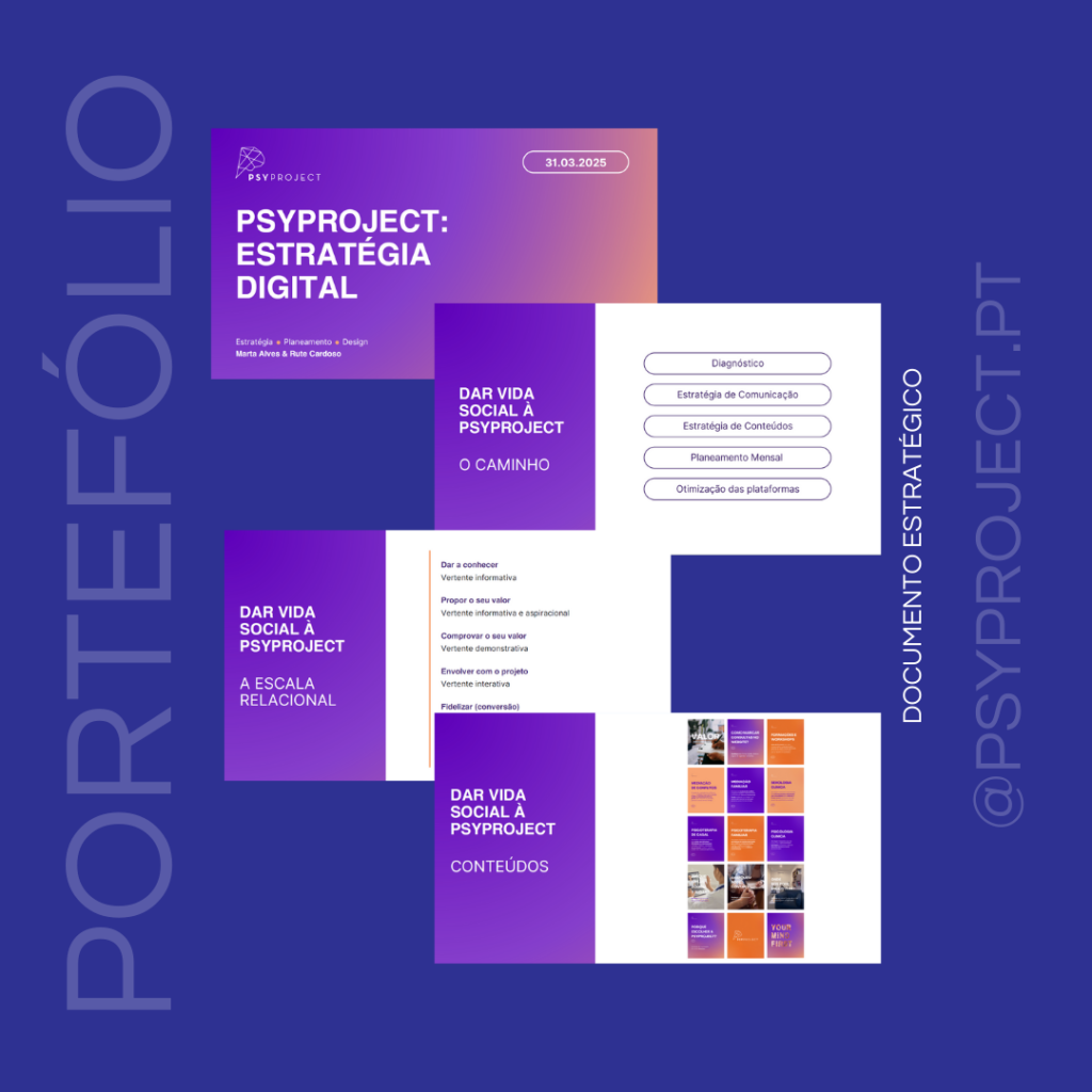 Projeto de maior consolidação no universo freelancing de gestão estratégica de redes sociais. O diagnóstico inicial, a criação e a otimização das plataformas, bem como a implementação da estratégia com a planificação mensal de conteúdos sobre saúde mental permitiu-me testar a minha polivalência de conhecimentos, versatilidade e capacidade de adaptação aos desafios.