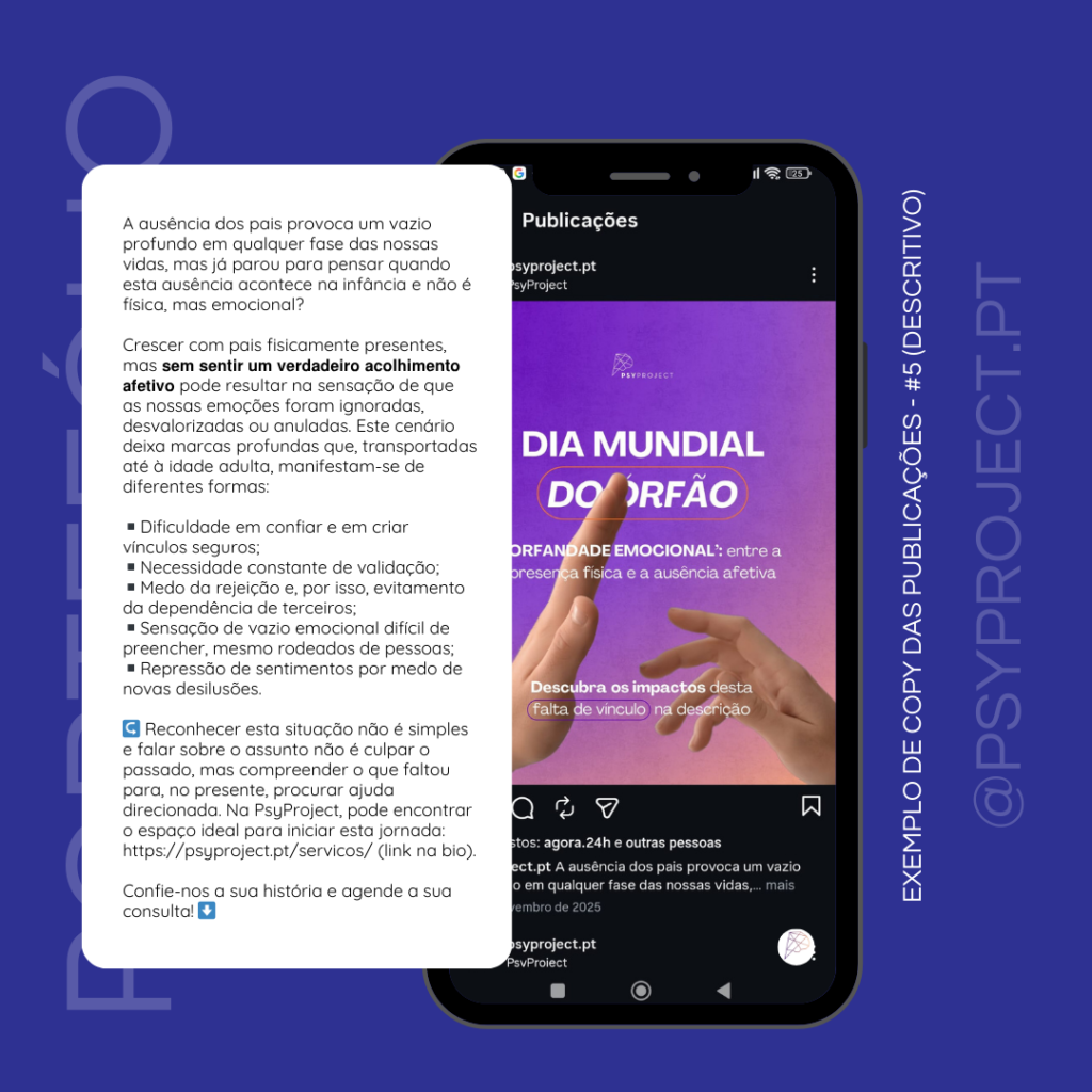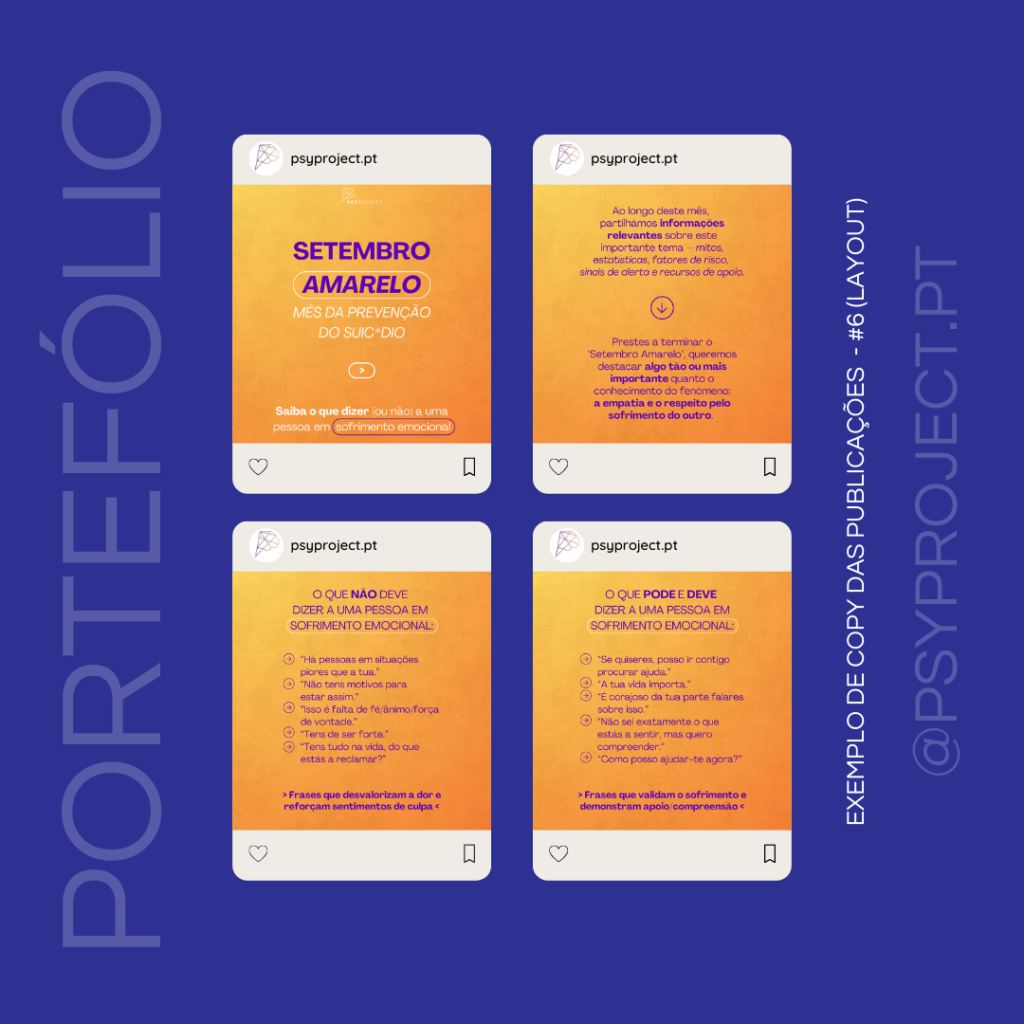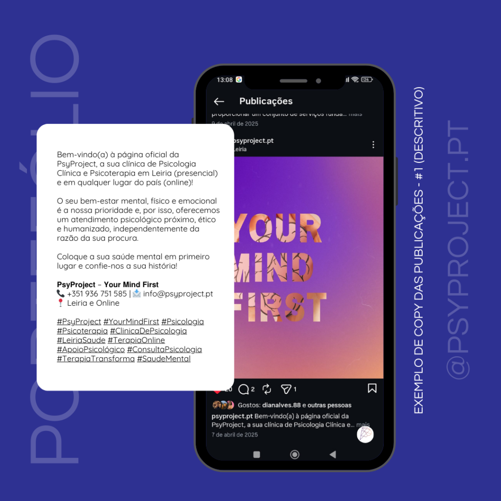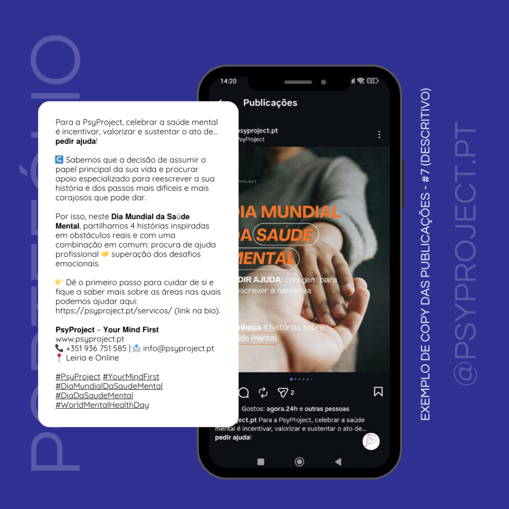 Projeto de maior consolidação no universo freelancing de gestão estratégica de redes sociais. O diagnóstico inicial, a criação e a otimização das plataformas, bem como a implementação da estratégia com a planificação mensal de conteúdos sobre saúde mental permitiu-me testar a minha polivalência de conhecimentos, versatilidade e capacidade de adaptação aos desafios.